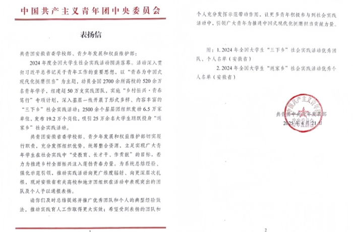 近日,共青团中央青年发展部发来表扬信,污污漫画 “天使护蕾”暑期社会实践团获得2024年全国大学生“三下乡”社会实践活动优秀团队。