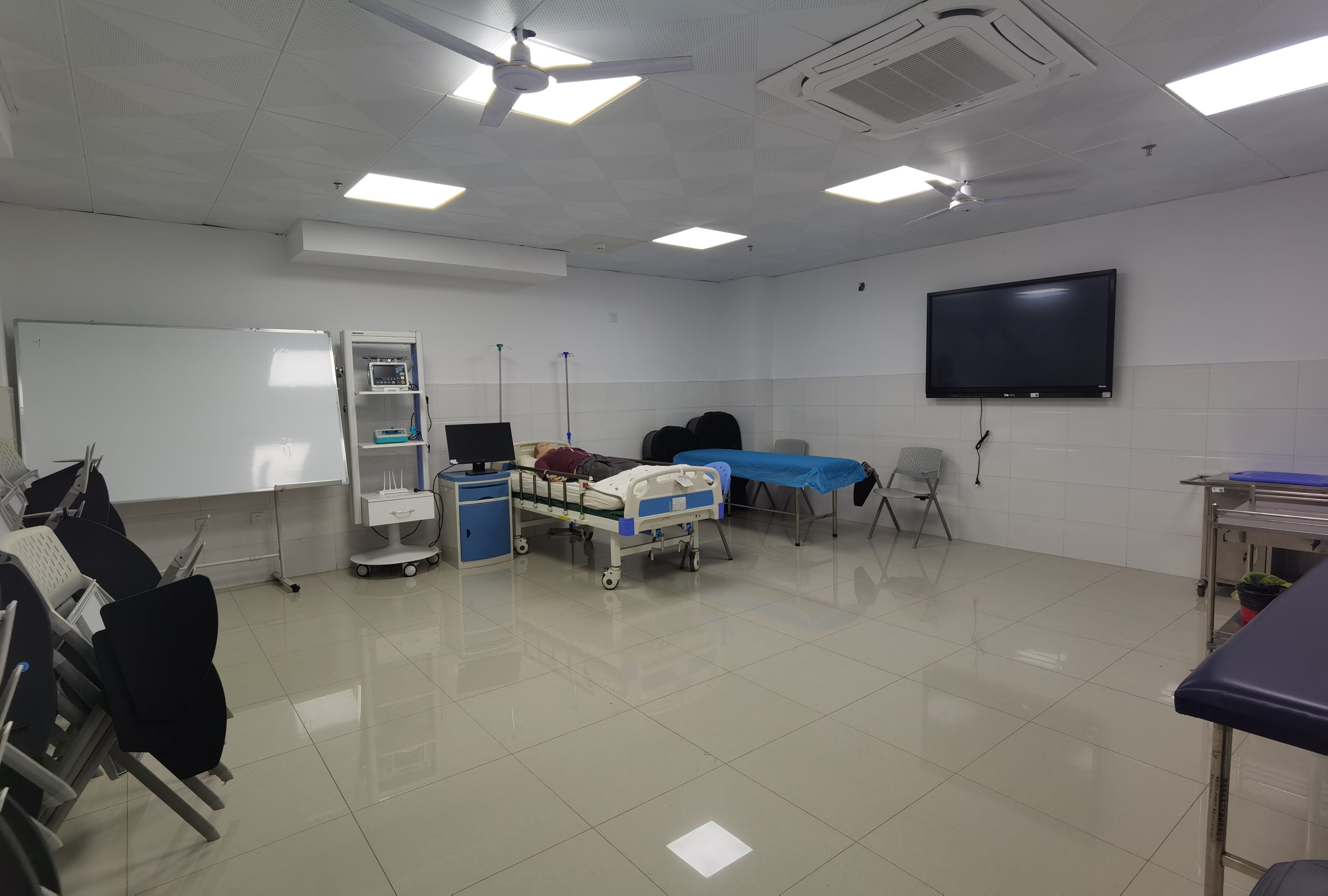 我院拥有SimMan模拟教学实验室共4间,实验室配备了先进的智能综合模型人(SimMan ALS、SimMan Essential、SimMan 3G Plus)共计4部,主要承担《护理综合实训》《内科护理学》《外科护理学》等课程的实践教学任务。教师通过电脑软件编辑模拟临床病例,设置各项生理指标的复杂变化,与实验室内配备的除颤仪、抢救车、移动吊塔等先进的仪器设备配合使用,模拟临床真实场景,为护生提供高仿真、安全、可反复试错的练习环境,从而缩小其在课堂理论与临床实践之间的差距。SimMan模拟教学可训练护生的临床思维能力、人文关怀能力、沟通能力和团队协作能力。实验室年均承担教学工作量约600学时。