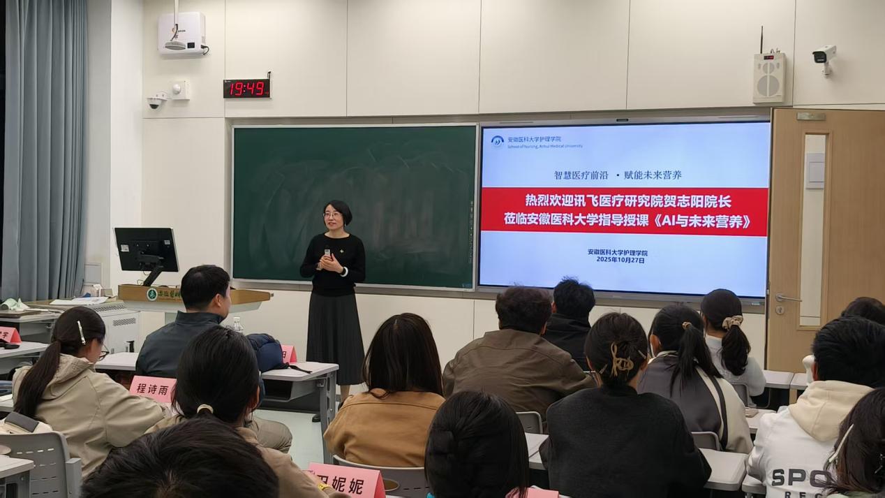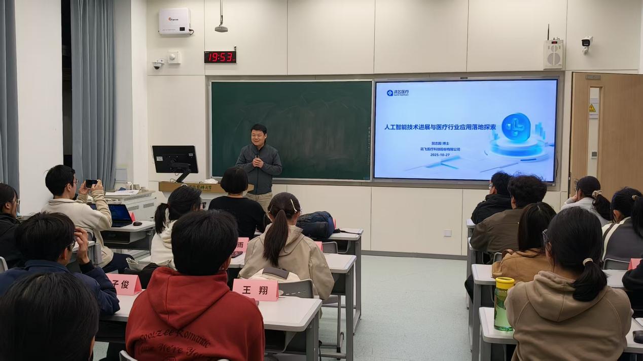 课程首讲特邀讯飞医疗研究院院长贺志阳研究员主讲,主题为《人工智能技术进展与医疗行业应用落地探索》。他结合自身在人工智能与医疗领域的深耕经验,深入浅出解读人工智能技术前沿进展,通过智能诊断系统的精准应用、讯飞医疗对医疗问题辅助解答、疾病预测大数据赋能等实际案例,生动展现AI技术在医疗行业的落地价值,让同学们对AI赋能医疗的无限可能建立直观认知。